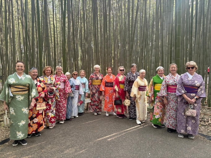 We stayed that night in Nagashima and we went to a lightshow in Nabana on Sato which was an amazing illumination featuring Mt Fuji; something like we’d never seen. Making our way to Nara the next day we met lots of wild deer that bowed when we fed them. In Kyoto that night, we had dinner with the geisha and a maiko and a 93-year-old geiko playing the shamisen and singing. Kyoto for three nights was just spectacular; beautiful weather and amazing autumn leaves. We went to Kinkakuji, the golden pavilion. Inspired by the geisha, the next day we wore kimonos into the Arashiyama bamboo grove where we were very well received. I heard local saying “subarashii”, (how wonderful) and “kawaii”, (we look so cute!) Lots of smiles from the locals. Nijo castle was on the agenda the next day and with the Nightingale floorboards, the samurai would hear if anyone entered the building as the floorboards squeak. A fabric dyeing workshop that afternoon was great fun, using stencils and paint with a brush and we learned how to fold furoshiki wrapping cloth.