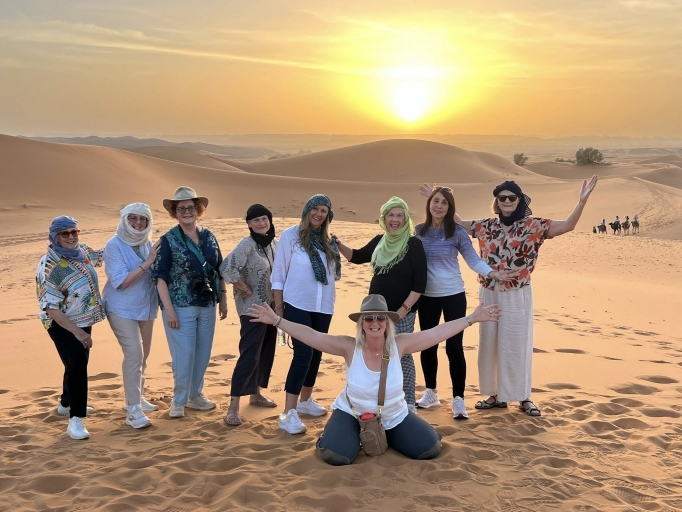 I often wonder why we chose a travel destination—Is it the adventure of somewhere different, the exotic & unknown, an interest in the culture, or inspired by a book or movie? Morocco ticked all these for me!. We arrived in Casablanca, which, surprisingly, is a modern city while at the same time respectful of its past and culture. The Mosque of Hassan II, built on an outcrop jutting into the Atlantic Ocean, dominates the city with its beauty and intricate Islamic architectural style. Onto the city of Rabat, the country's capital, for an overnight stay and opportunity to visit the nearby Chellah Kasbah. Set in lush green gardens with a history of Roman domination and ruins that were later used as a royal necropolis. Before I go on, what is a Kasbah? "a traditional fortified structure or a fortified palace complex", Onto the nearby Udayas Kasbah, a historic fortress and residential quarter of old Rabat with its wide blue and white streets, artisan shops, bustling cafes and Andalusian Gardens created a magical atmosphere of a time long gone - we were all falling under the spell of Morocco's magic. Chefchaouen was our next stop. Staying in our centrally located Riad, we were able to explore and, yes, get lost in this wondrous city of blue with its winding alleys and souks, every corner a photo opportunity that couldn't quite capture the beauty of the town. We dined in the bustling main square, people-watching, enjoying the colours and music of the night. En route to Fes, we stopped at the UNESCO-listed site of Volubilis - wow!! What a surprise to find a Roman archaeological site spanning 42 acres and dating back to the 1st century AD. Our 3-night stay in Fes was at the Riad Le Jardin Des Biehn, an oasis of comfort and charm, plus a great restaurant and excellent staff. Fes was the city where the sisters had waited to go shopping, and shopping we did! The Fes Medina is approximately 740 acres, with over 9,000 narrow alleys, streets, and lanes offering everything and anything! Leather coats, bags, slippers, and souvenirs were bought, not forgetting the few carpets to be shipped home! Travelling south east from Fes through the Atlas mountains towards Merzouga - the gateway to the Sahara Desert and our much anticipated overnight stay in the desert. The vastness and solitude of the Sahara were magic, and even though we were a group of chattering women. We all felt the serenity and connection lost in our own thoughts as our camels plodded through the dunes, each of us treasuring and holding onto this special time. Our itinerary continued to Ouarzazate, a city known as the Hollywood of Morocco. Home to the Atlas Film studios and the setting for many Hollywood films, along with the nearby fortified village of Ait Benhaddou and the Kasbah Taourirt (not to mention our stunning Raid with its large pool and day spa), made it a perfect spot for our 2-night stay. Marrakech is known as the Red City, due to its many buildings and walls being constructed from the red, ochre, and pink clay from the nearby plains. It is the country's economic centre and home to grand palaces and mosques. Our days were filled with exploring the nearby Medina and, yes, more shopping!. A hands-on Moroccan cooking class followed by an afternoon of pampering at a hammam (traditional steam bath). A private perfume workshop, where we created our own special scent and a visit to the "most beautiful garden in the world," the Majorelle Gardens. Set over 12 acres, with a collection of plants from 5 continents, it is an artist's garden of plants and colour, and the legacy of French designer Yves Saint Laurent. It was great to catch up with Hayley and visit her project of passion, "Sass Riad", which promises to be stunning when completed, and we now understand Hayley's love of Morocco. Our tour was coming to an end as we headed towards the seaside town of Essaouira. A comfortable and relaxed town, we explored the old fishing port and the UNESCO historic Medina with last-minute shopping for souvenirs and silver jewellery. Back to Casablanca for our last night and farewell dinner at the legendary "Rick's Café". Three weeks of wondrous sights —mountains, deserts, palaces, Mosques, and delicious food —along with the hospitality of the Moroccan people, had come to an end. Morocco, the destination, was magic, and the journey shared with nine amazing and supportive sisters made it a trip of a lifetime.
