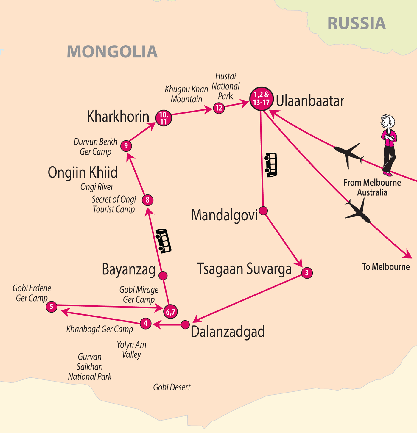 Your tour hostess and fellow travellers will meet you at the designated departure point at Melbourne Airport for your flight to Ulaanbaatar.