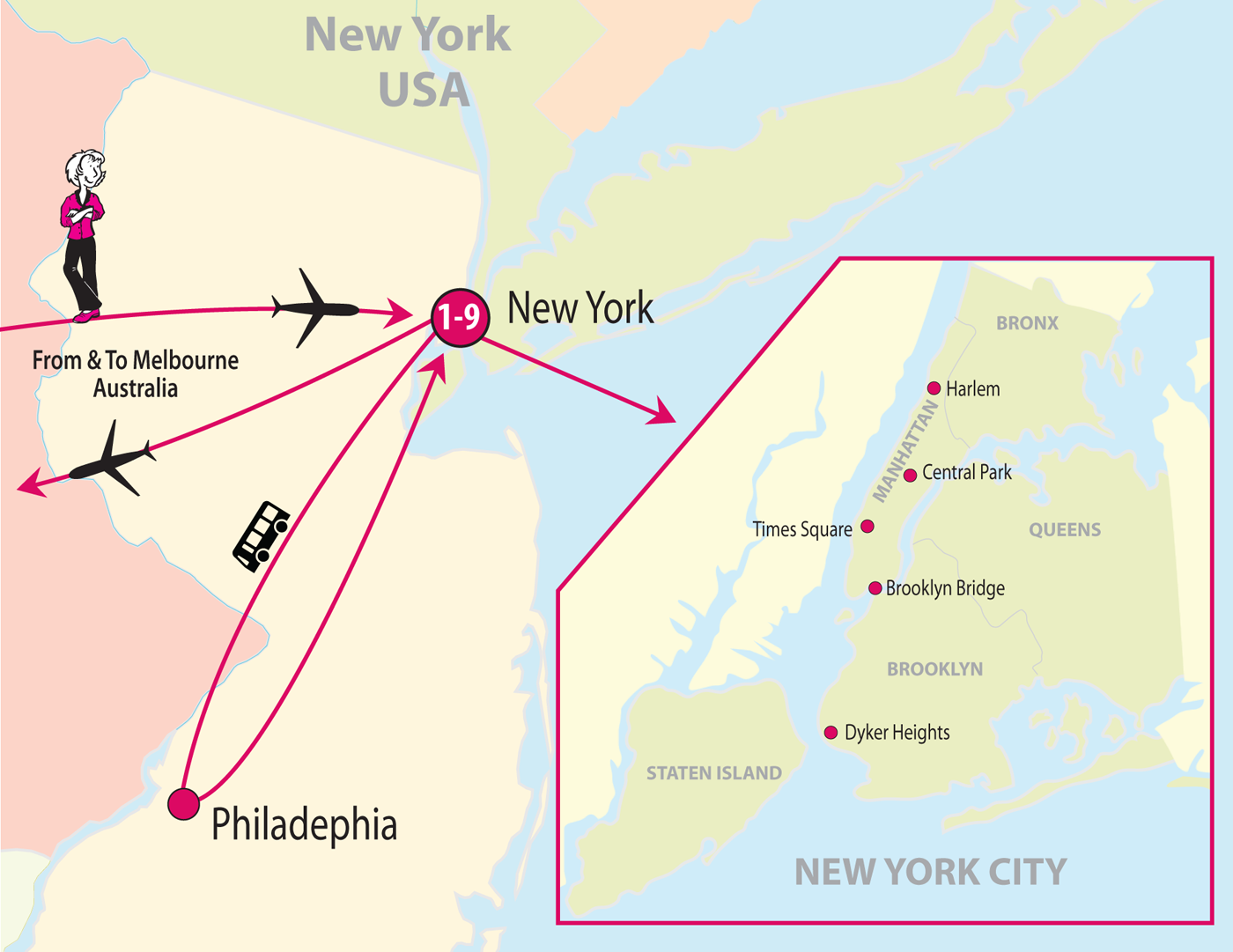 Welcome to Sisterhood Womens Travel. Meet your tour hostess and fellow travellers at the Melbourne Airport for your flight to New York, USA.